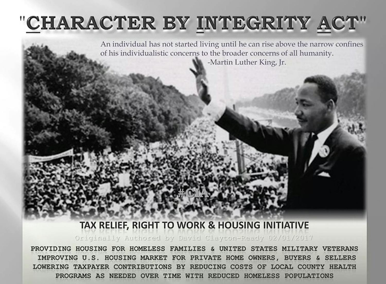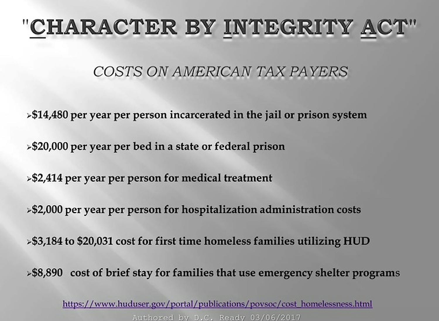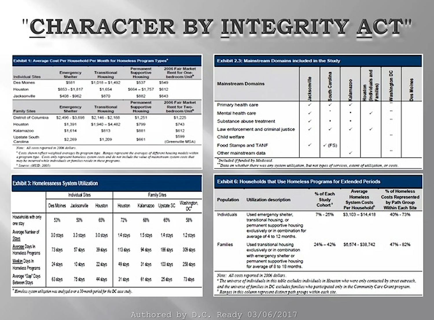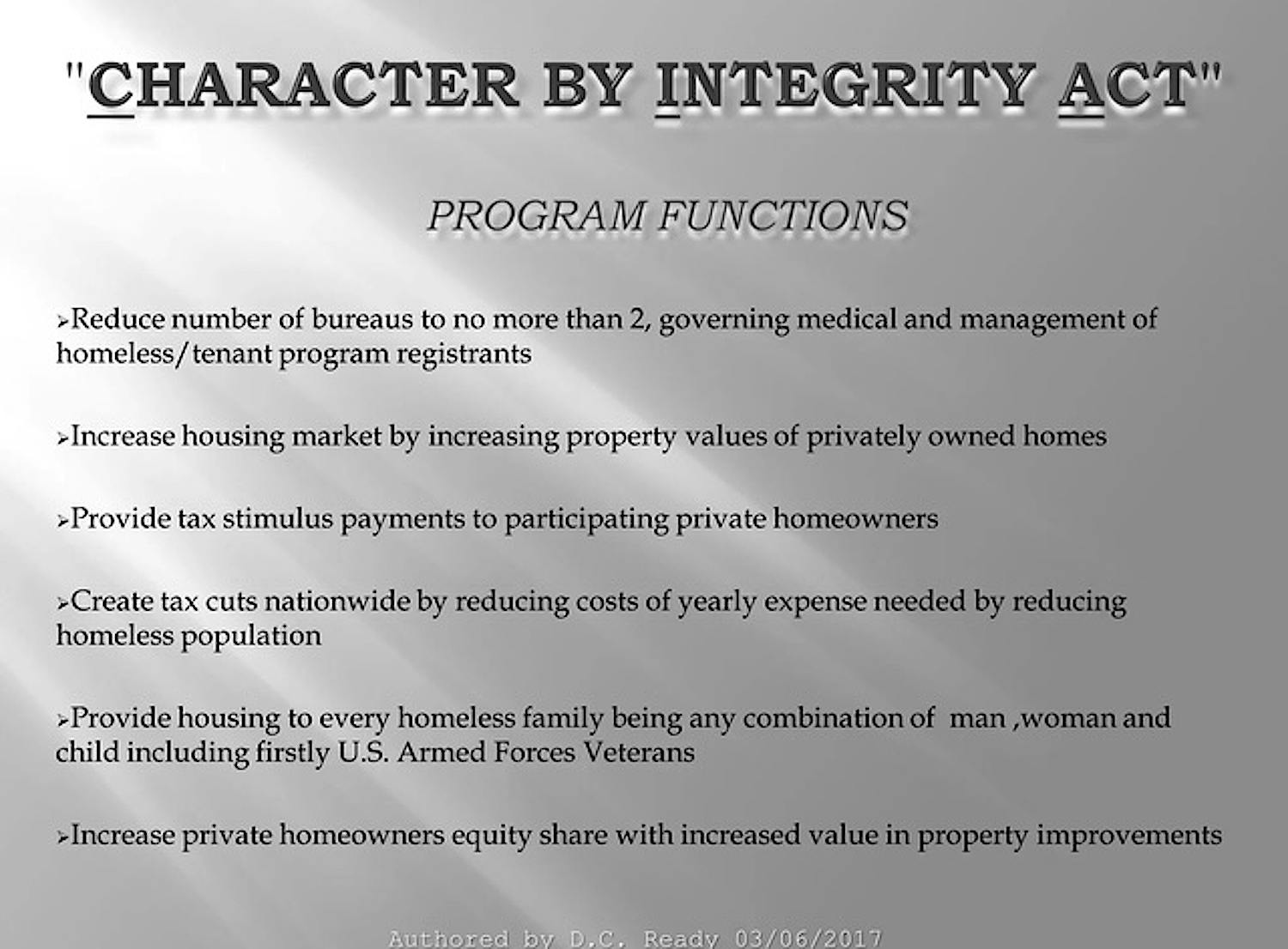 My Character by Integrity Act outlines a housing initiative for unhoused families and U.S. military veterans that improves the housing market while reducing taxpayer contributions. It specifies costs associated with incarceration and homelessness, proposes tax cuts to stimulate home ownership, and details program requirements, including employment for tenants and conditions for using privately owned homes. The initiative emphasizes increasing property values and managing homelessness through targeted support for specific populations.